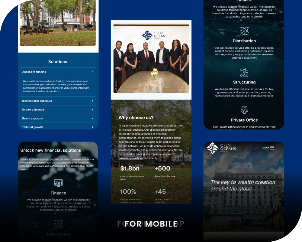 We crafted custom user interface components including distinctive investment portfolio visualisations, service explanations, and team credentials that differentiate Open Oceans Group from competitors while maintaining appropriate restraint.