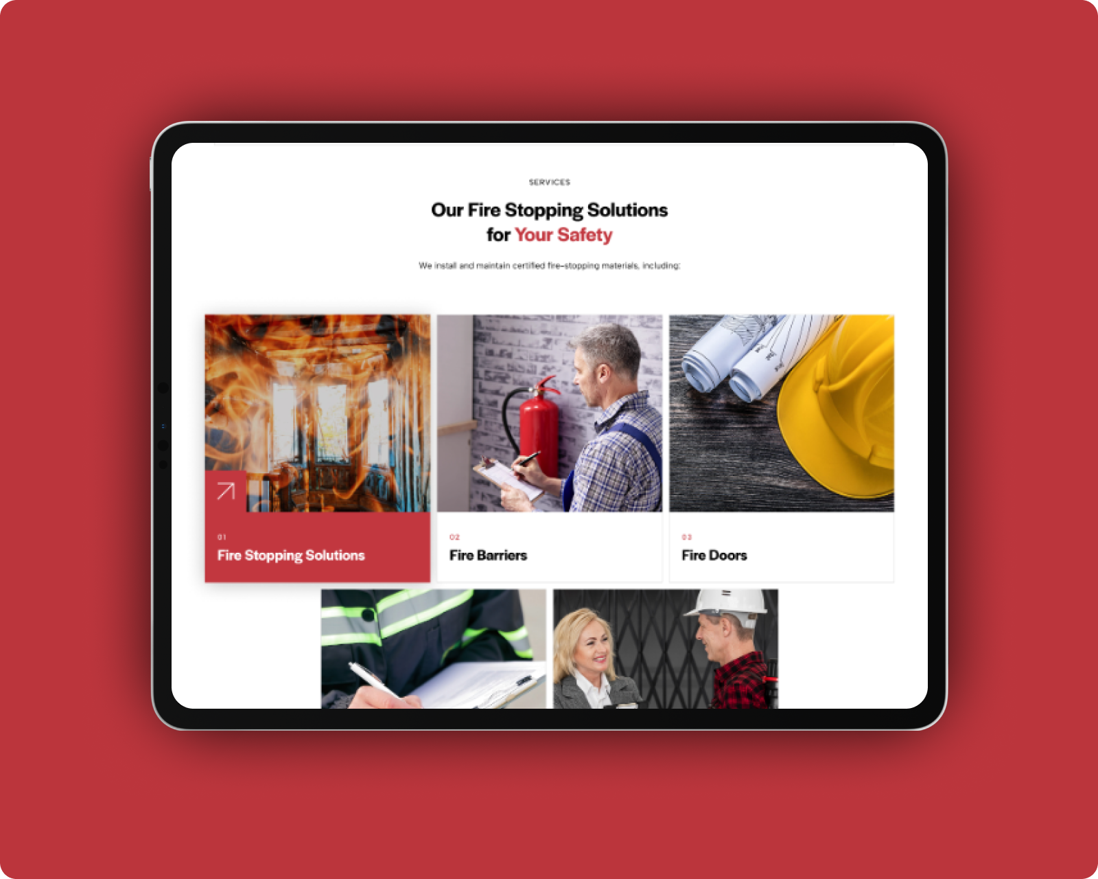 The new platform is structured around their core services, including Surveying, Fire Stopping, Fire Barriers, Fire Doors, and Remedial Works, supported by interactive elements, sector-specific navigation, and clearly displayed accreditations that strengthen trust.